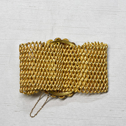 金色のブレスレットは、表面へ同色でストライプに模様が入った幅約1mmぐらいのピンチベックの金線と、模様の無い光沢のある先の物と同じ幅のピンチベックの金線の二本を編み込んで、しなやかなブレスを作り上げています。