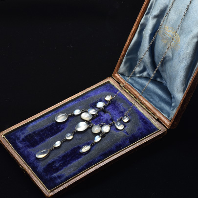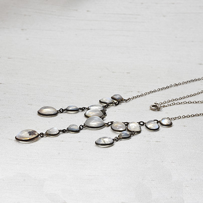 サイズグラデーションに連ねたネックレスの3か所から更に2石、3石を下へと垂らした、シンプルながらアンティークらしいデザインが魅力。