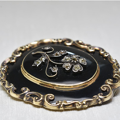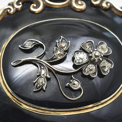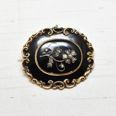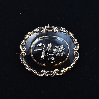 センターに忘れな草をあしらったこちらのブローチは、亡くなった方を偲んで作られましたモーニングジュリーです。(私を忘れないで という花言葉を持つ忘れな草は、多くのモーニングジュエリーへ登場致します)