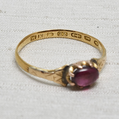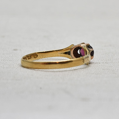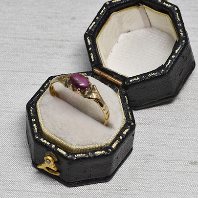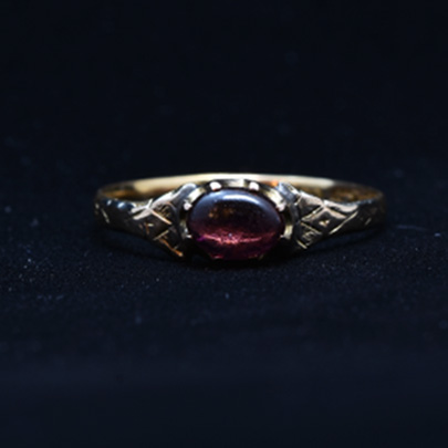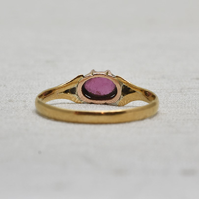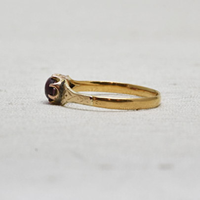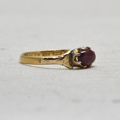 光を当てると深いピンク色にも見えるカボションカットのガーネットが印象的な19世紀のリング。