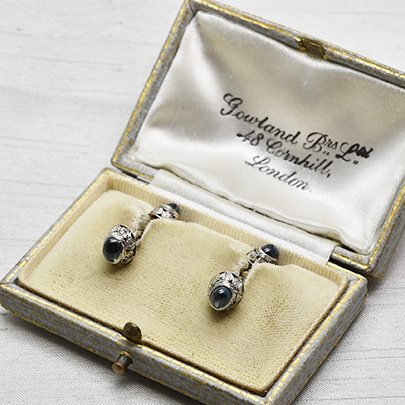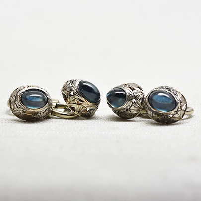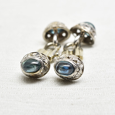 地金は貝を並べたような透かし模様で、カボションカットのサファイアは濃い色です。