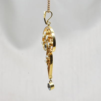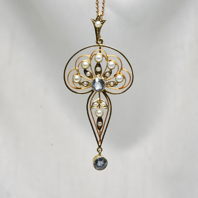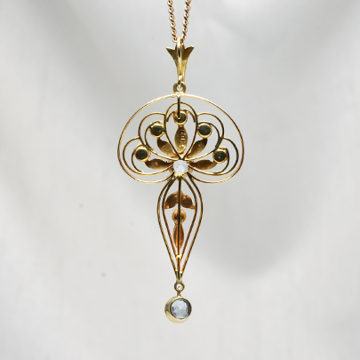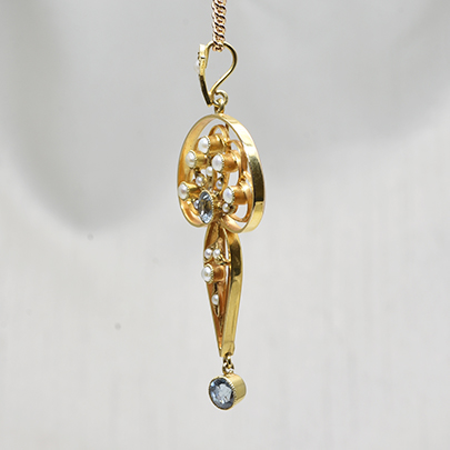 こちらはヌーボー期のデザインを感じさせる曲線美の中にデコ期のキリッとした雰囲気を併せ持つペンダントです。