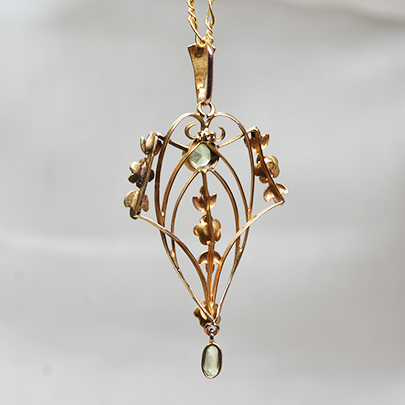 若草色のお石はペリドットで覆輪留めされており、下部のパーツは揺れるデザインです。