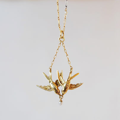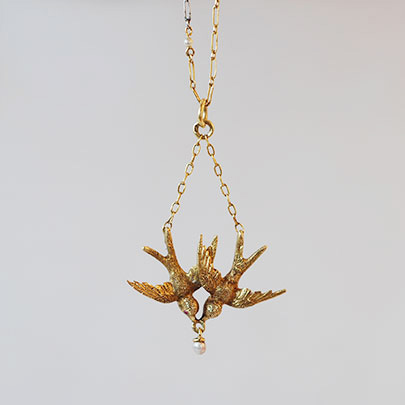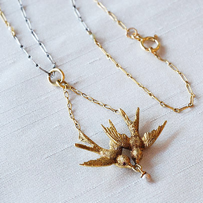 翼を重ね合い、二羽で一つのパールをくわえているつがいのツバメ。チェーンはコンビで作られており、パールがあしらわれていて繊細で華やかです。ツバメは、毎年古巣に戻ってきて子育てをすることから、回帰の象徴という意味もあります。あなたに回帰します、というラブメッセージなのかもしれません。