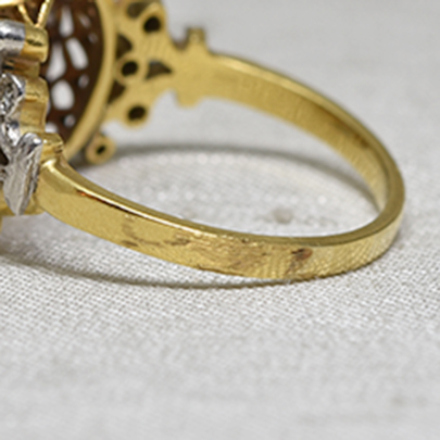 ダイヤ周りのプラチナと思われる白い金属のアウトラインには、ミルグレインが打たれています。