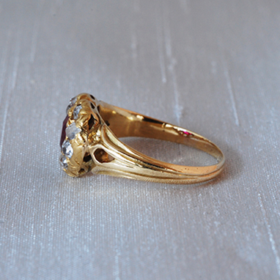 引き込まれるような深い赤色とキラキラと光るダイヤモンドが大変美しいリング。