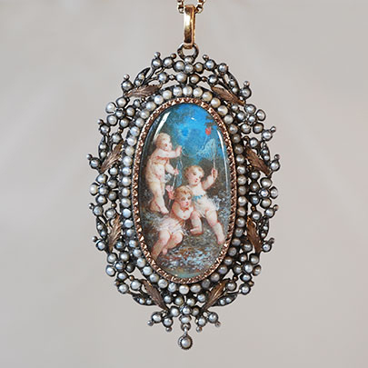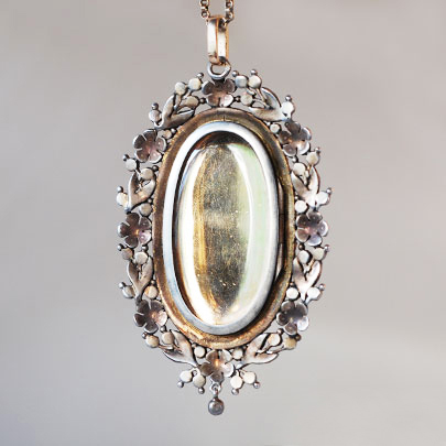 裏側の真ん中のオーバル形のガラスの蓋は蝶番で止められていますので、観音開きに開いて中に写真を入れられるロケットとして使用できます