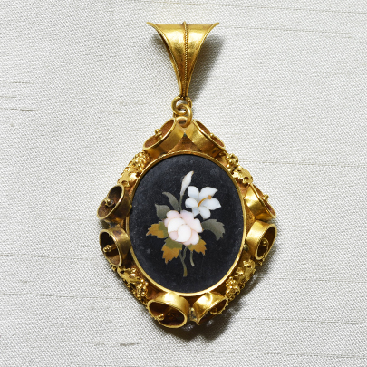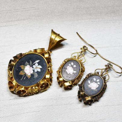 モザイクの中でも、滑らかな美しさを持つフローレンスモザイクのペンダントとイヤリングのセットです。