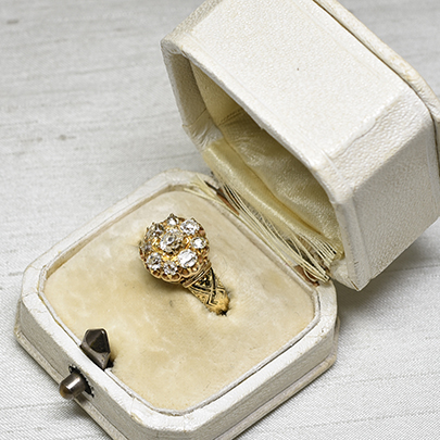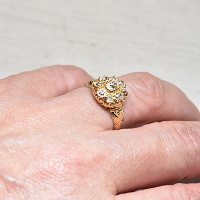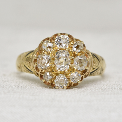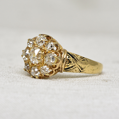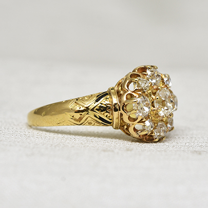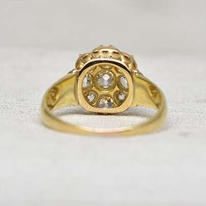 センターへ大粒のオールドマインカットダイヤが、その周りには8石のサイズ違いのオールドヨーロピアンカットダイヤやオールドマインカットダイヤが取り巻くクラスターリング。