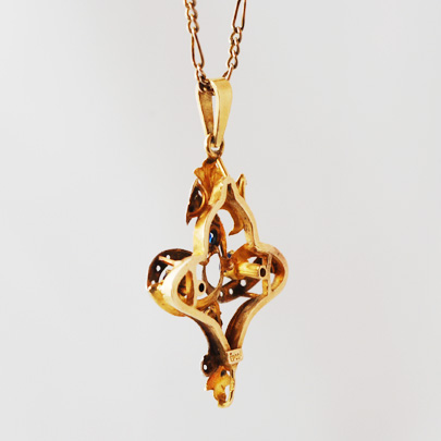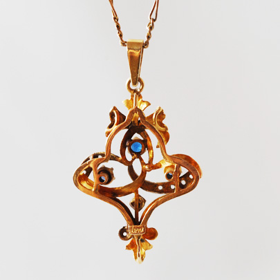ホワイトと赤みがかったゴールドのコンビネーションがとても珍しい一品です。リボンが絡み合ったようなモチーフ。アール・ヌーヴォーのようでひと味違った雰囲気が個性的です。ホワイト部分にダイヤモンド。中央3石には上にガーネット、下にブルーのペーストのダブレットが配されコクのある深い青色がデザイン全体にキリッとスパイスを効かせています。