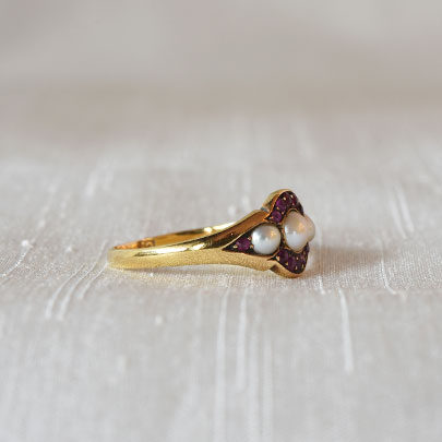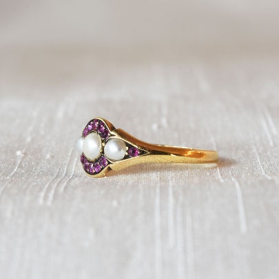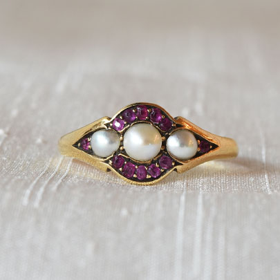 三石並んだハーフパールをルビーで取り巻いた幾何学模様.